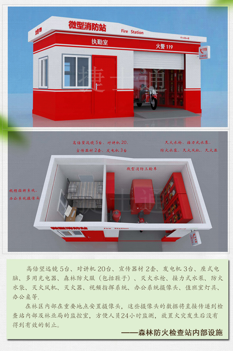 檢查站的工作人員要嚴(yán)格對(duì)進(jìn)入林區(qū)的人員、機(jī)動(dòng)車實(shí)施檢查和教育,扣留火種并對(duì)人員、車輛做好登記。 為了加強(qiáng)森林防火檢查站的管理,充分發(fā)揮防火檢查站的職能,每個(gè)地區(qū)的林業(yè)站、林業(yè)局都應(yīng)該設(shè)立相應(yīng)的森林防火檢查站,與山林的重要路口處。 森林防火檢查站內(nèi)部設(shè)施:高倍望遠(yuǎn)鏡 5臺(tái)、對(duì)講機(jī) 20、宣傳器材 2套、發(fā)電機(jī) 3臺(tái)、座式電腦、多用充電器、森林防火服(包括鞋子)、滅火水槍、接力式水泵、防火水袋、滅火風(fēng)機(jī)、滅火器、視頻指揮系統(tǒng)、辦公系統(tǒng)攝像頭、值班室燈具、辦公桌等. 在林區(qū)內(nèi)部在重要地點(diǎn)安置攝像頭,這些攝像頭的數(shù)據(jù)將直接傳遞到檢查站內(nèi)部及林業(yè)局的監(jiān)控室,方便人員24小時(shí)監(jiān)測(cè),放置火災(zāi)發(fā)生后沒(méi)有得到有效的制止。 天津市捷士通科技有限公司10幾年來(lái)一直致力于戶外移動(dòng)房屋的研發(fā)和生產(chǎn),在森林防火檢查站上面有一套成熟的方案,也為首都北京的森林防火工作出過(guò)應(yīng)有的力量。 天津市捷士通科技有限公司,有專業(yè)的移動(dòng)房屋生產(chǎn)線,可以在短時(shí)間內(nèi)大量生產(chǎn)客戶需要的產(chǎn)品,有專業(yè)的研發(fā)團(tuán)隊(duì),針對(duì)客戶的需求做到配比度極高??梢园l(fā)全國(guó),全國(guó)均有合作的物流公司。